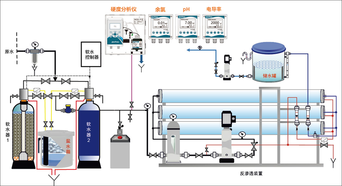 水中的硬度和余氯直接影響反滲透膜的使用壽命和產(chǎn)水回收率,在線檢測硬度和余氯對RO系統(tǒng)至關(guān)重要。