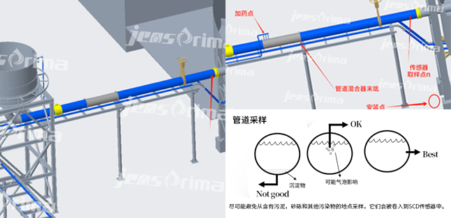 針對水廠現(xiàn)場工況環(huán)境我們將儀器安裝在盡可能靠近混合器的地方,必須確保絮凝劑與水樣完全混合。一般現(xiàn)場安裝取樣分為兩種:混合池取樣和管道取樣