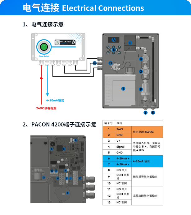 PACON 4200分析儀供電電源為24VDC直流電,務(wù)必正確接線。錯(cuò)誤的電源連接導(dǎo)致儀器損壞將不在質(zhì)保范圍內(nèi)。